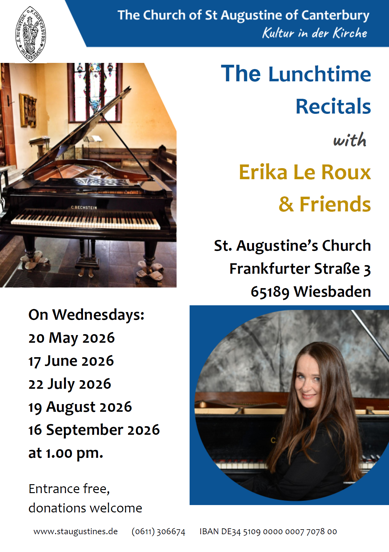For information about our concert program or if you are interested in using the church as a venue for a concert of your own, please contact our Fine Arts Committee: finearts@staugustines.de