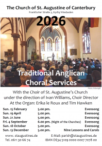 Five – six times a year St. Augustine’s offers Anglican Evensong – a beautiful, traditional service of hymns, readings, prayers and canticles, much of which is chanted or sung. It has become popular with many non-Anglican churches. The canticles, responses, and anthems are sung by our choir. Evensong is usually offered at 5 pm on selected Sundays – and at the annual Night of the Churches event (first Friday in September).