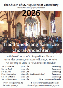 Am Sonntag, 15. Februar um 17:00 Uhr lädt die anglikanische Kirche St. Augustine of Canterbury zum ersten Choral Evensong (Vesper in anglikanischer Tradition) des Jahres 2026 ein. Weitere Termine sind am Sonntag: 19.04.26, 21.06.26, und 18.10.26.